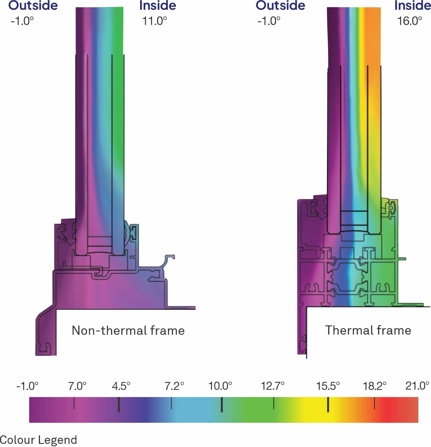 These models show a noticeable difference in the inside non-thermal vs thermal frame temperatures. (Outside temperatures on each model are -1C. Clearly, thermal frames reduce the heating needed to create a warm, comfortable home.